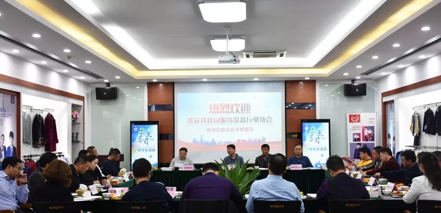 考察團邀請到中國教育后勤協(xié)會(huì )校服管理專(zhuān)業(yè)委員會(huì )副主任金堅兵、南寧市新希望教育用品有限責任公司總經(jīng)理勞豪參與交流會(huì ),在交流會(huì )中,分別對校服協(xié)會(huì )會(huì )員企業(yè)的經(jīng)營(yíng)與管理提出建議與思路、分享經(jīng)驗。