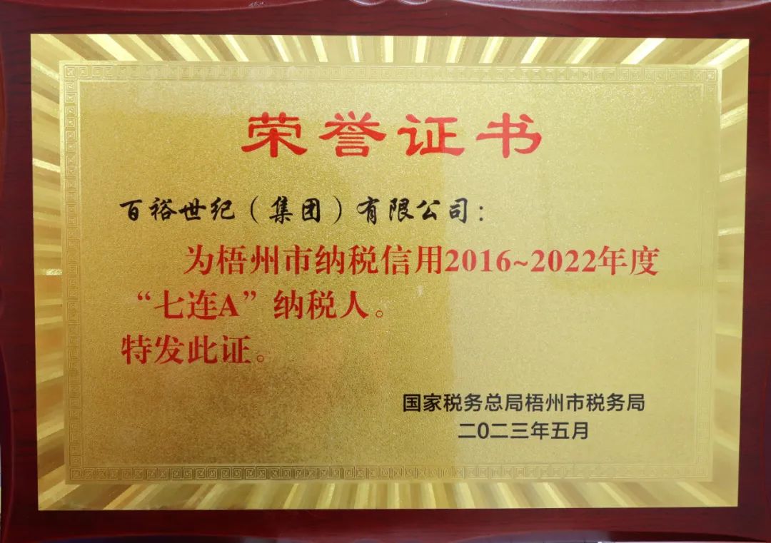 近日,經(jīng)國家稅務(wù)總局梧州市稅務(wù)局評審,百裕世紀(集團)有限公司被評為2016~2022年度“七連A”納稅人,這是我們堅持依法、誠信經(jīng)營(yíng)的實(shí)質(zhì)成果。