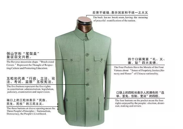 前襟的五粒紐扣和五個(gè)口袋(一個(gè)在內側)分別表示孫中山先生的五權憲法學(xué)說(shuō)(行政權、立法權、司法權、考試權,還有監察權在領(lǐng)口(紐扣)和內側(口袋),以彰顯監察權的人民監督作用);