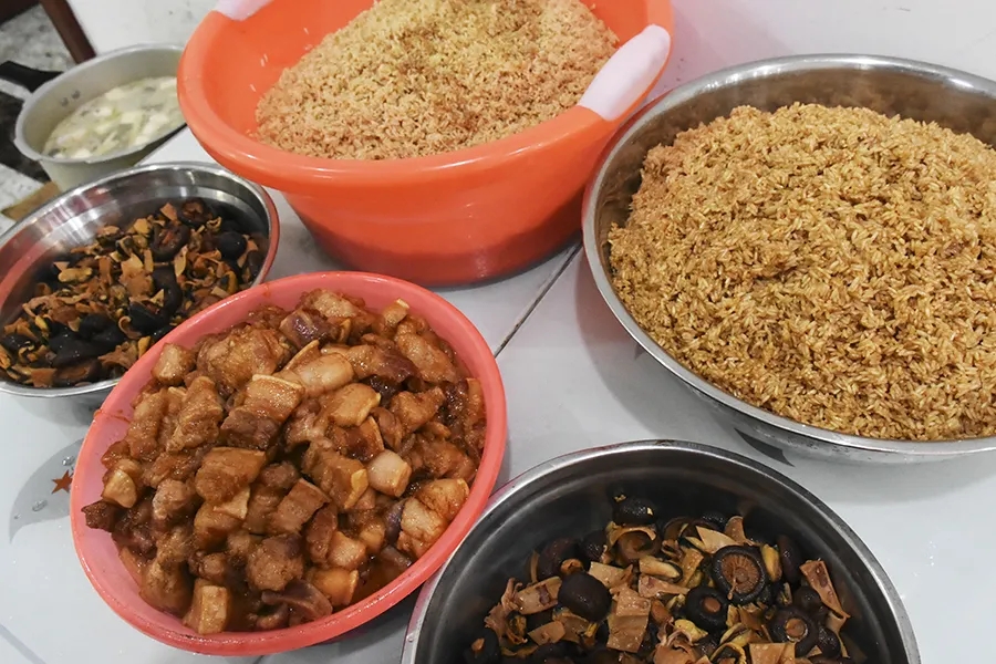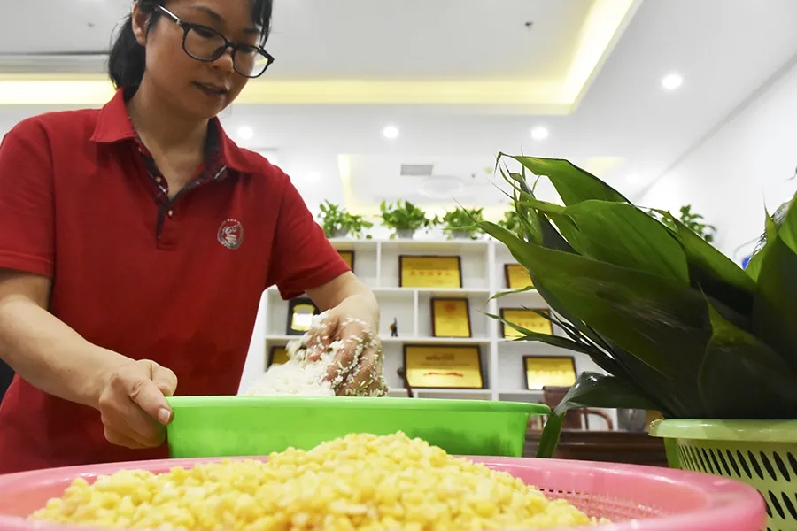 后勤部精心為大家準備了豐富的食材五花肉、雞蛋、香菇、魷魚(yú)、海蠣、綠豆,并根據員工喜好調配好兩種不同口味餡料。