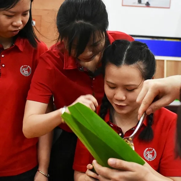 當然也有部分尚未掌握到技巧的小伙伴,這會(huì )兒就是體現團隊精神的時(shí)候了。大伙兒你教我,我幫你,互相交流學(xué)習,合作分工,不一會(huì )兒,一個(gè)個(gè)充滿(mǎn)個(gè)性的粽子就出來(lái)了。