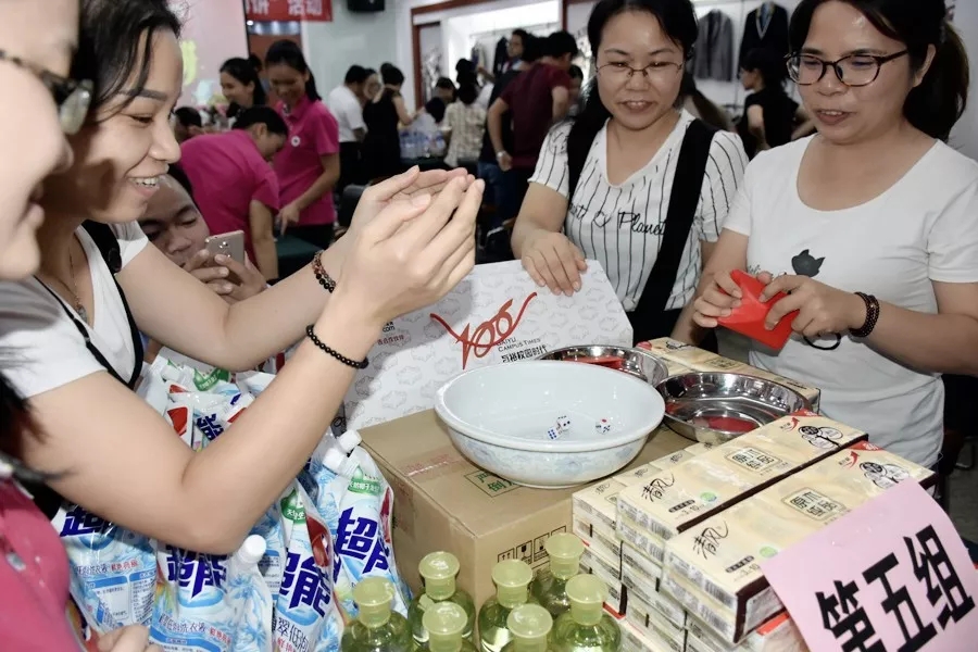 博餅的號角一經(jīng)蔡總經(jīng)理吹響,各個(gè)小組(八人圍成一桌,妥妥準備就緒)果斷開(kāi)撕,場(chǎng)面十足熱鬧。一時(shí)間,骰子與碗碰撞的清脆聲、奪得大獎時(shí)的歡呼聲此起彼伏。